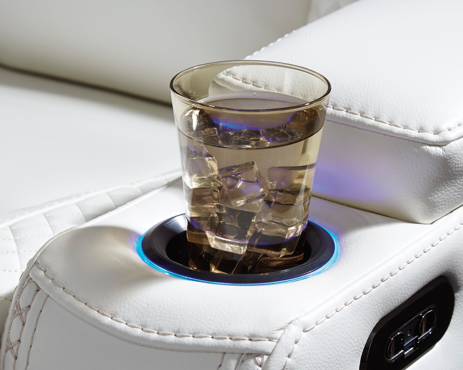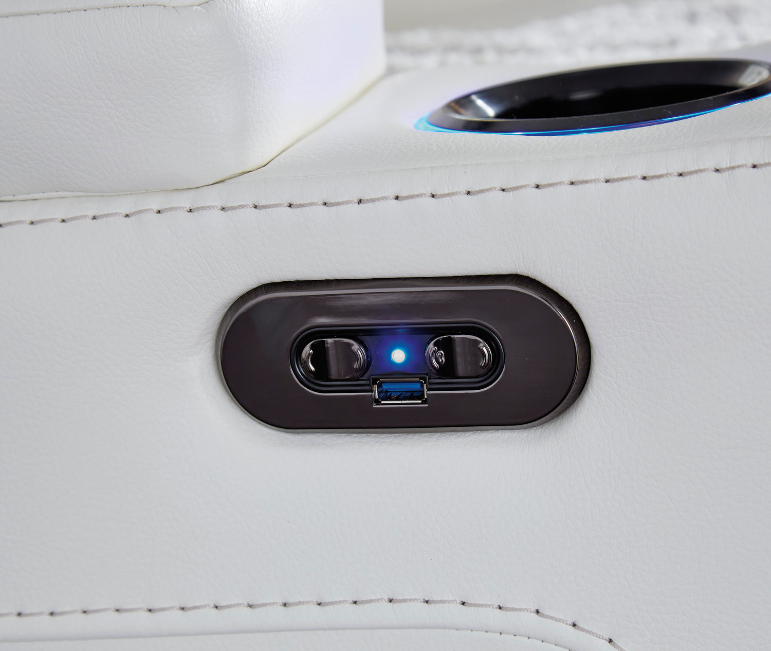 - LED lighted cup holders; flip up padded armrests with hidden storage