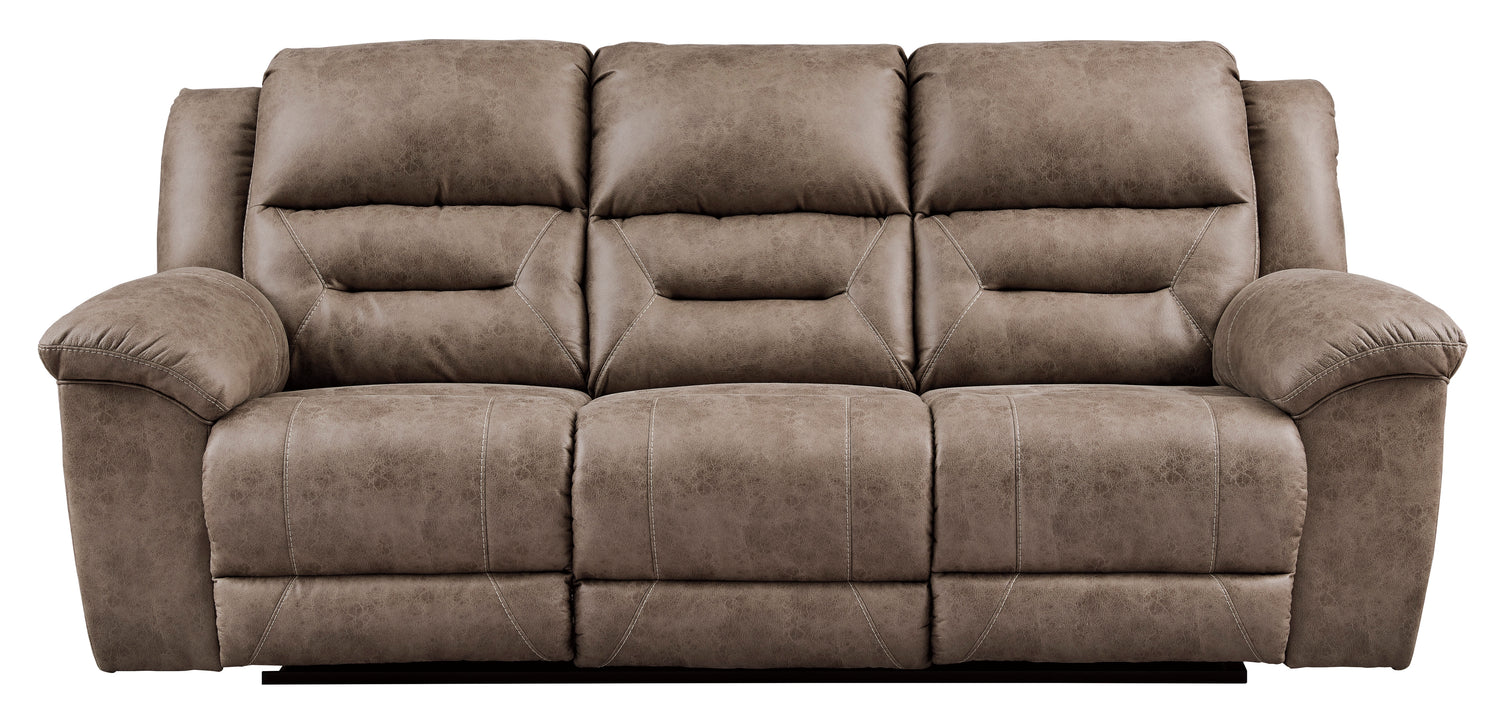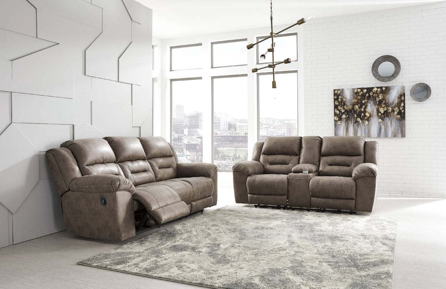 For those that love the cool look of leather but long for the warm feel of fabric, the Stoneland power reclining sofa and power reclining loveseat deliver both with ease. When it’s time to relax, the one-touch power control puts the perfect position at your fingertips. Channel-stitched back cushions provide indulgent lumbar support for maximum comfort—not to mention fashion-forward flair.- Includes power reclining sofa and power reclining loveseat with console