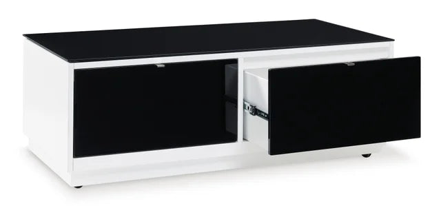 Made with MDF substratesHigh-gloss white finishBlack glass tabletop; black acrylic laminate drawer fronts2 smooth-gliding drawersOpen display shelfCasters for easy mobility