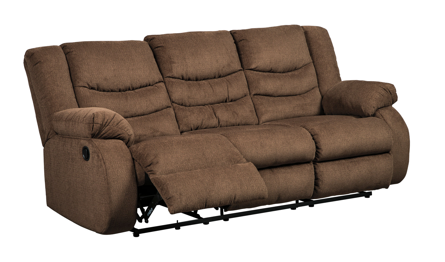 The Tulen reclining sofa and loveseat set puts the win in winning. Its waterfall back design and doubly plump pillow top arms team up with soft chenille fabric to go for the goal. Ample seating room makes the comfort possibilities endless. Sit back and relax. You won’t go wrong with this reclining set.- Includes sofa and loveseat