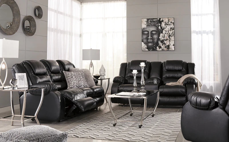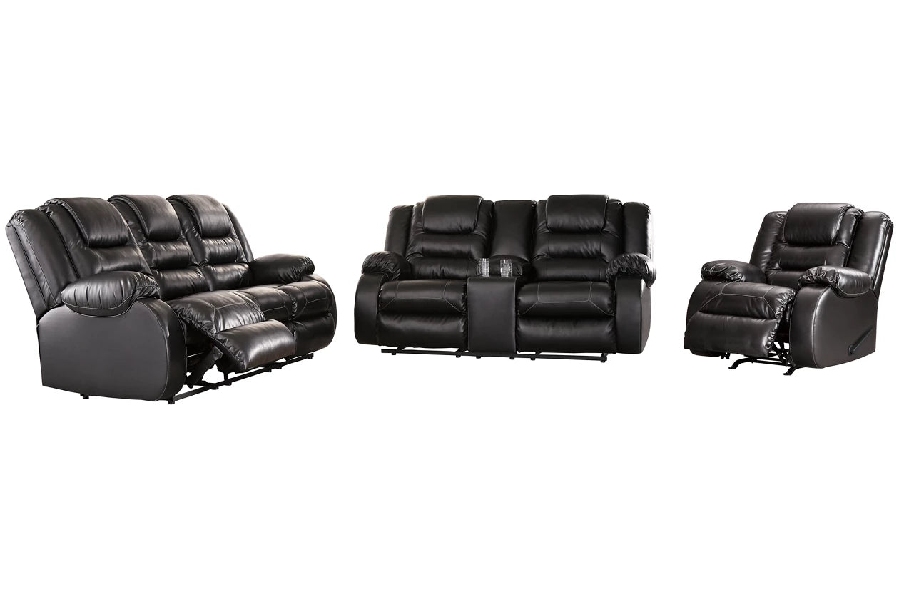When it comes to comfort, style and value, the Vacherie faux leather living room set with reclining sofa, reclining loveseat and rocker recliner in black rocks. Tailored for feel-good flair, its fashion-forward bustle back design is enhanced with sculpted padding on the headrest for cradling support. Channel cushioning along the sides flows into thick, wrapped pillowtop armrests that are truly over the top. And while it might look like you broke the bank, a sumptuously soft leather-like fabric keeps indulgence well within budget.- Includes reclining sofa, reclining loveseat with console and rocker recliner