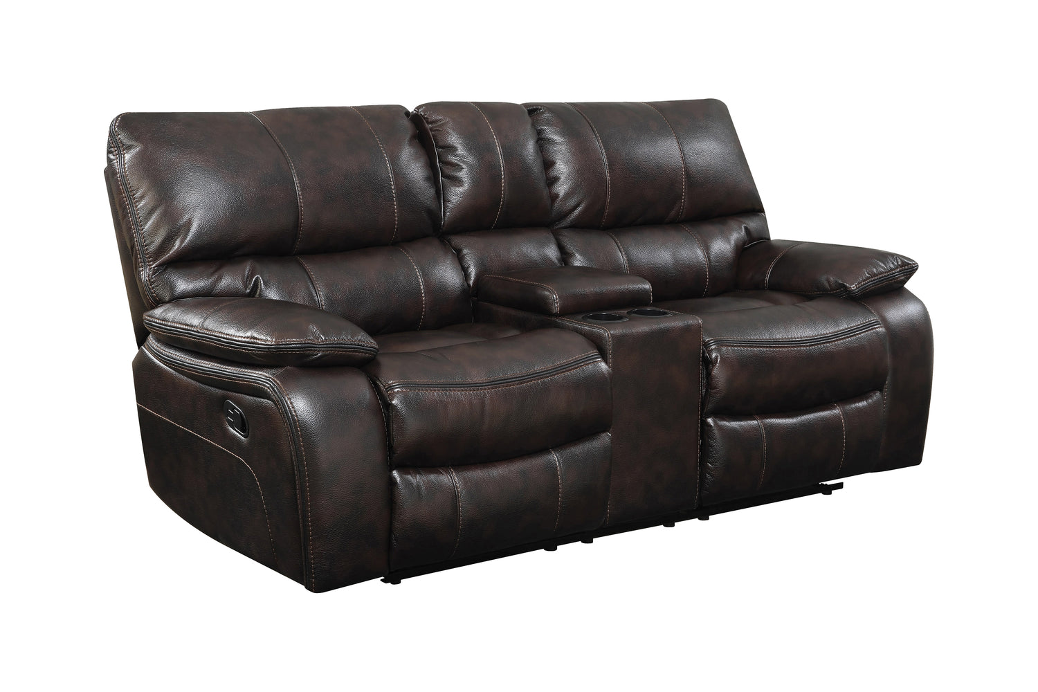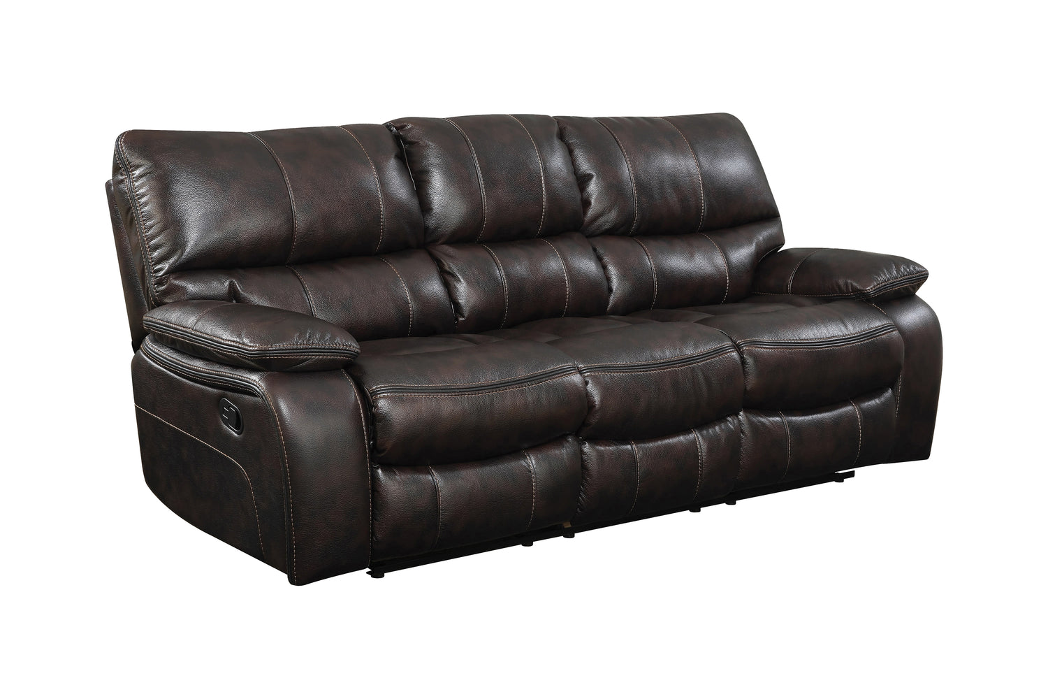 - Motion sofa collection upholstered in dark brown performance-grade leatherette