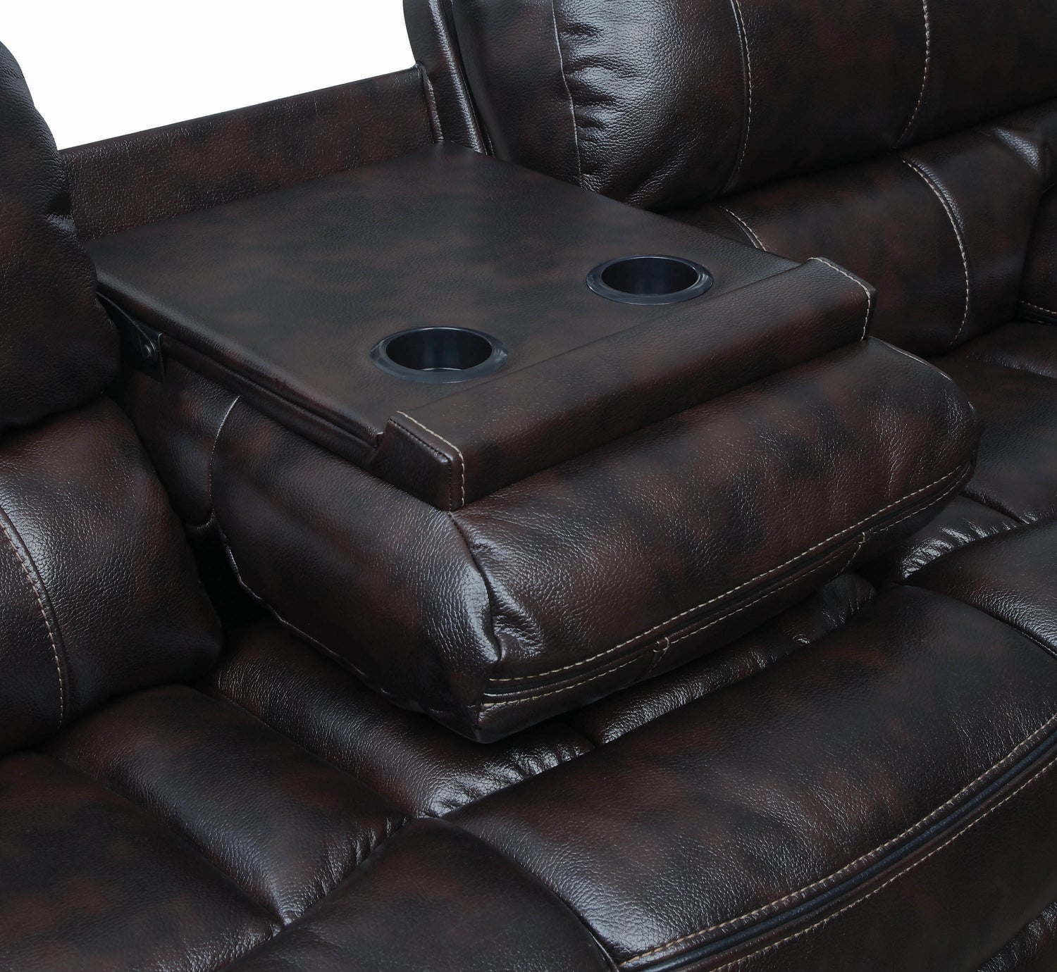 - Sofa features drop-down table with two (2) cup holders