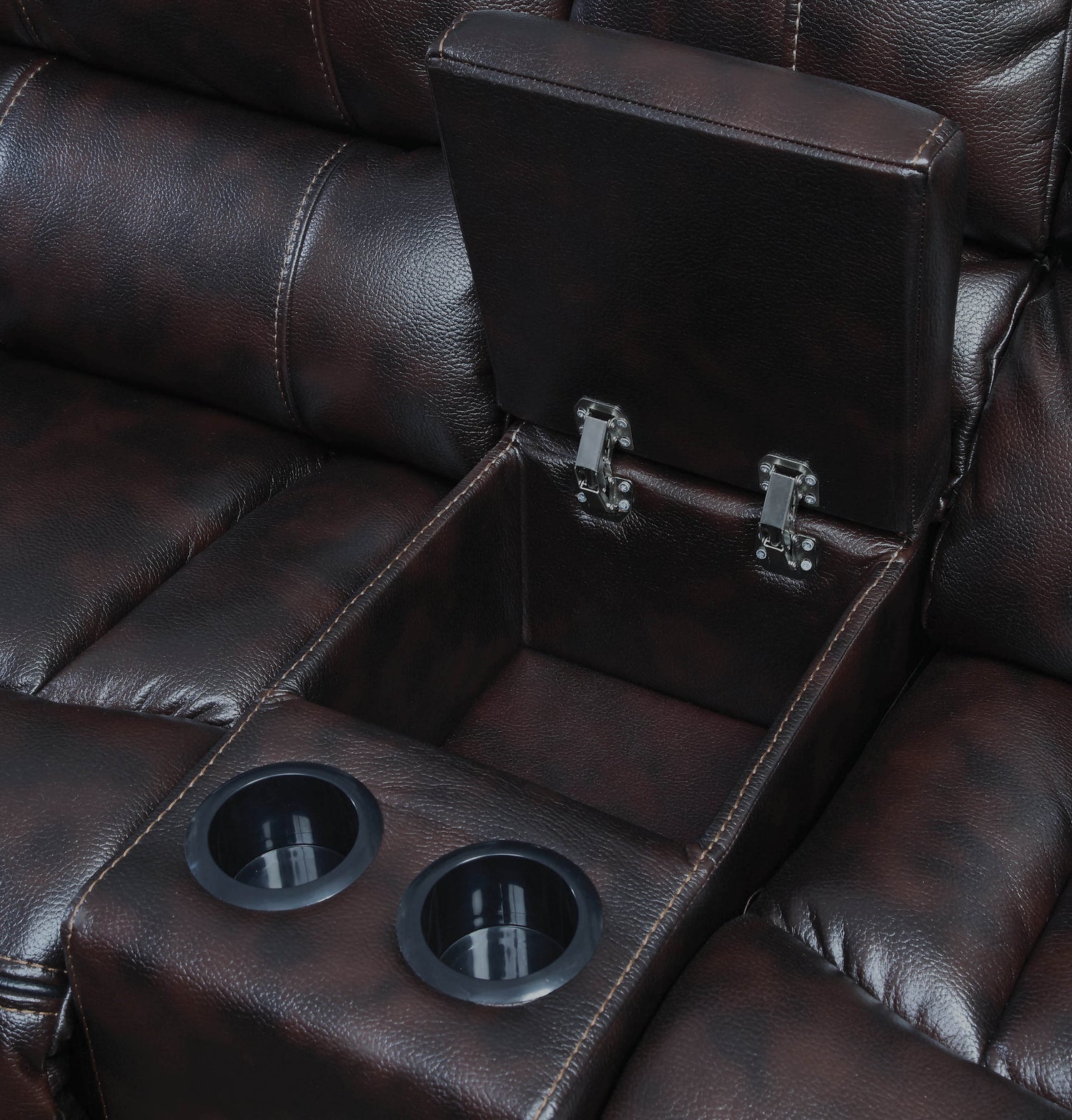 - Loveseat console features LED reading light, soft-closing lift top storage with power outlet (2AC/2USB), and two (2) removable stainless steel cup holders
