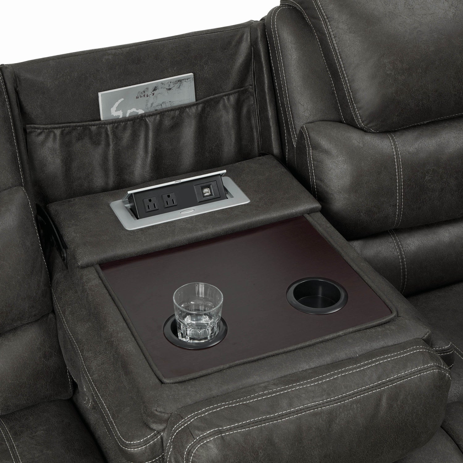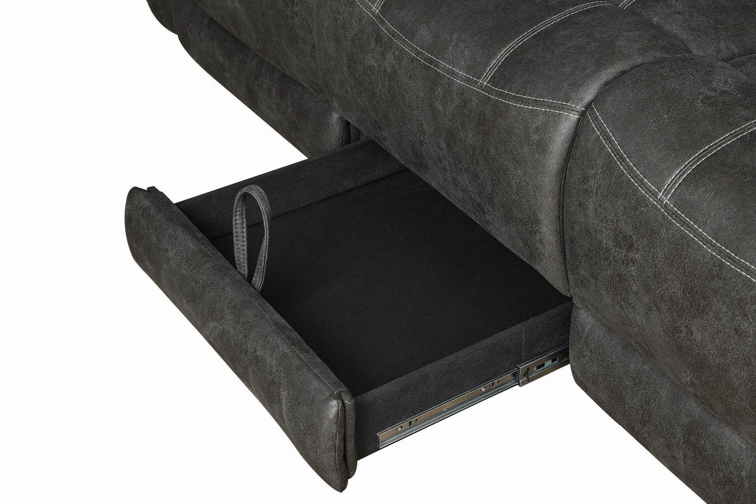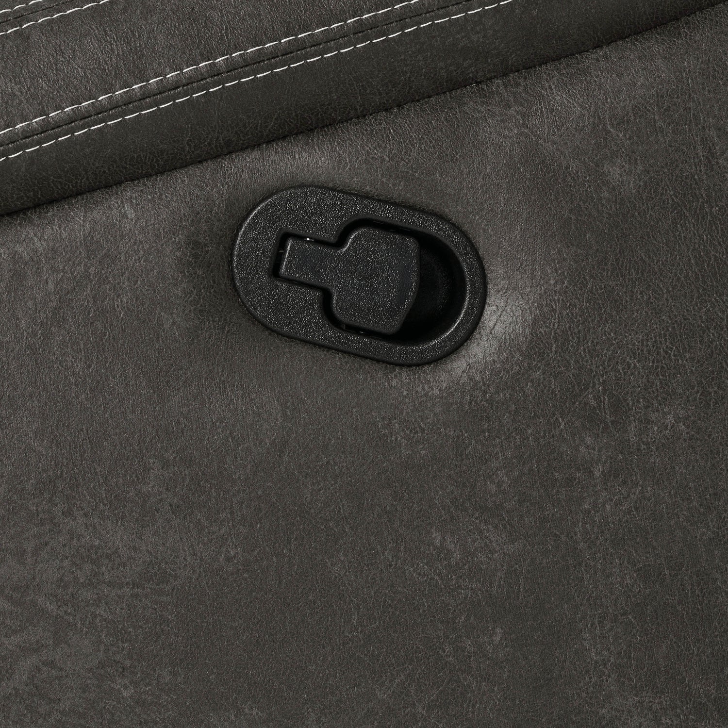 Comfort and style combine perfectly in this elegant motion living room set. Seats and headrests feature overstuffed cushions that are simply irresistible. Flared seat backs convey rest and relaxation. Soft armrests feature a nearly-concealed lever just below for easy reclining. Wrapped in sumptuous grey leather-like material with detailed white contrast stitching that's sure to please.