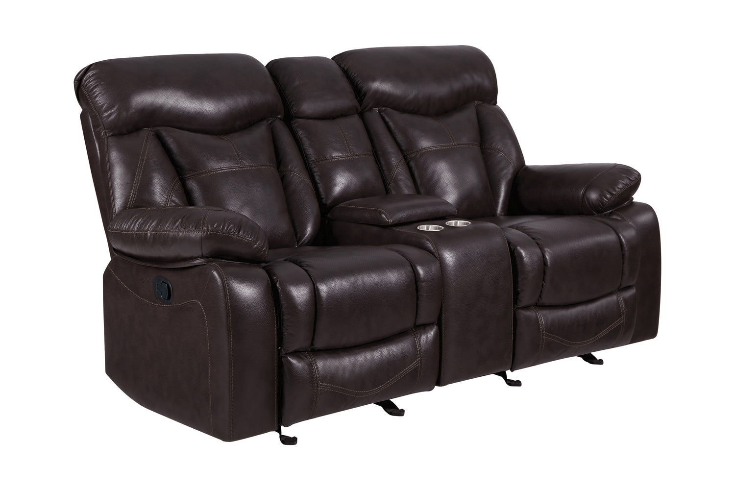 Relax in style with the cozy and inviting elements from this three-piece motion set. Plush cushions from the sofa, loveseat, and recliner don breathable leatherette upholstery. Streamline an entertainment or living room with the rich, dark brown hue. Contrast stitching along the plush and perforated back and seating surfaces looks modern while welcoming air flow. Complete with a built-in console including two cup holders.