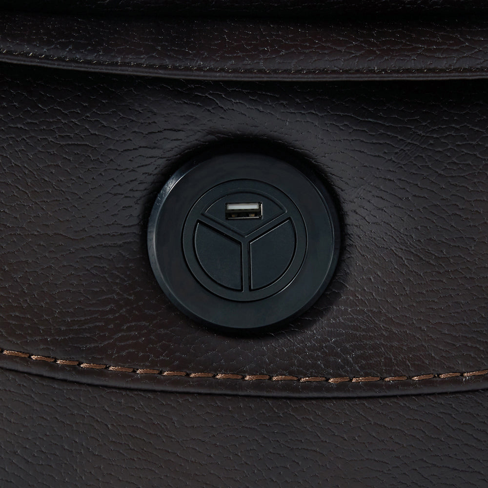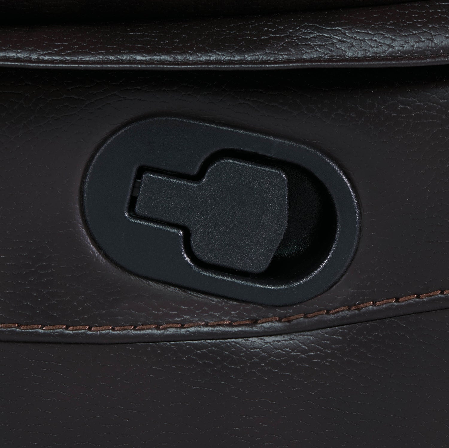 - Motion sofa collection upholstered in dark brown performance-grade leatherette